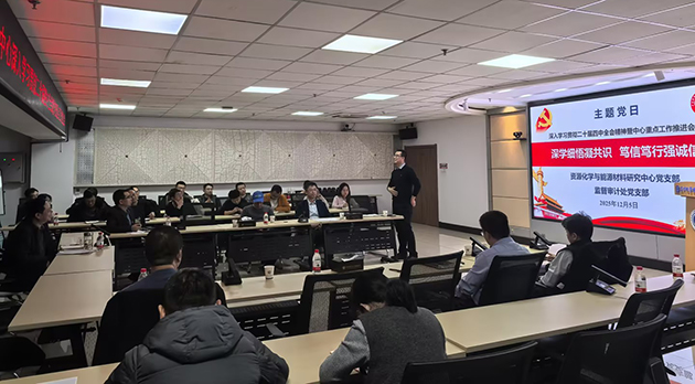 为深入学习贯彻党的二十届四中全会精神,切实将学习成果转化为推动科研工作高质量发展的实际成效,12月5日下午,中国科学院兰州化学物理研究所资源化学与能源材料研究中心党支部与监督审计处党支部联合举办“深学细悟凝共识 笃信笃行强诚信”主题党日活动。资源化学与能源材料研究中心党支部书记牟斌主持会议。两个支部全体党员和党外科技骨干参加会议。