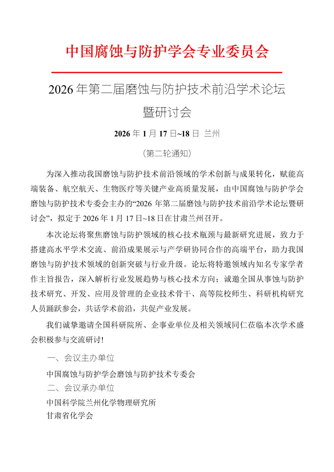 2026年第二届磨蚀与防护技术前沿学术论坛暨研讨会(第二轮通知)