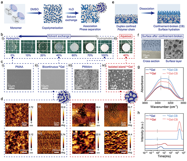 图2. (a) 通过溶剂交换策略制备结构可调线性共聚物水凝胶网络的示意图。(b) 不同MAAm含量(摩尔分数)水凝胶的宏观光学照片。(c) 不同水凝胶的扫描电镜图像。(d)BiGel和IsoGel的原子力显微镜高度图与相图。(e) 表面限域破坏处理形成润滑层的示意图。(f) BiGel-CB截面扫描电镜图像,显示梯度结构。(g) BiGel、IsoGel及其限域破坏后样品表面的ATR-FTIR光谱。(h) 不同水凝胶的LF-NMR T₂弛豫时间分布。