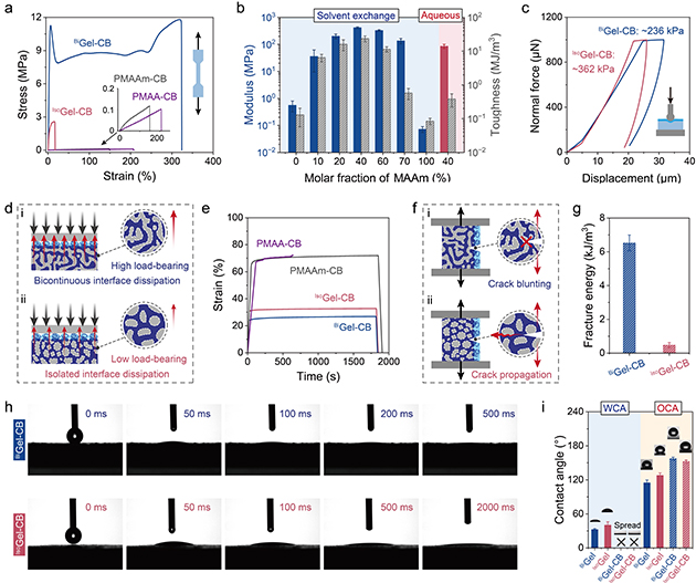图3. (a) 不同水凝胶的单轴拉伸应力-应变曲线。(b) 杨氏模量和韧性与MAAm含量的关系。(c) 表面纳米压痕测试曲线。(d) 抗蠕变性能测试示意图及(e)蠕变曲线。(f) 纯剪切测试示意图及(g)断裂能结果。(h) 水滴在BiGel-CB和IsoGel-CB表面的动态铺展过程。(i) 超亲水及水下超疏油性能评估。