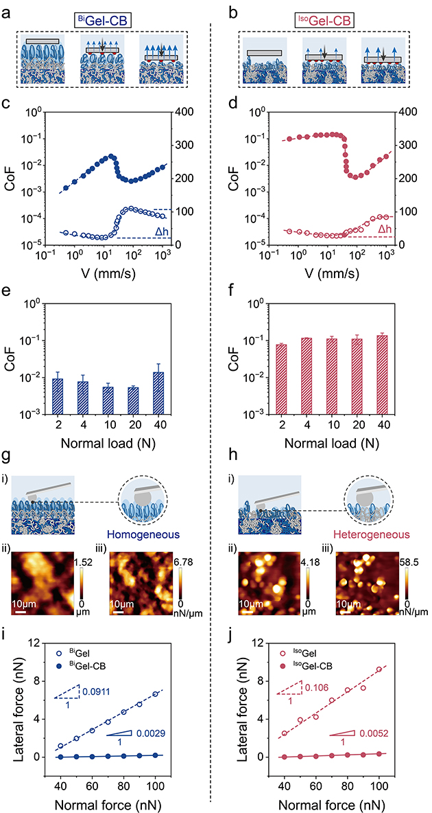 图4.(a) BiGel-CB和(b) IsoGel-CB的润滑机制示意图。(c, d) BiGel-CB和IsoGel-CB的Stribeck曲线及相应水合高度变化。(e, f) 在边界润滑状态下,摩擦系数随载荷的变化。(g, h) BiGel-CB和IsoGel-CB表面的AFM高度图。(k, l) 利用LFM测得的侧向力-法向力曲线及计算得出的微观摩擦系数。