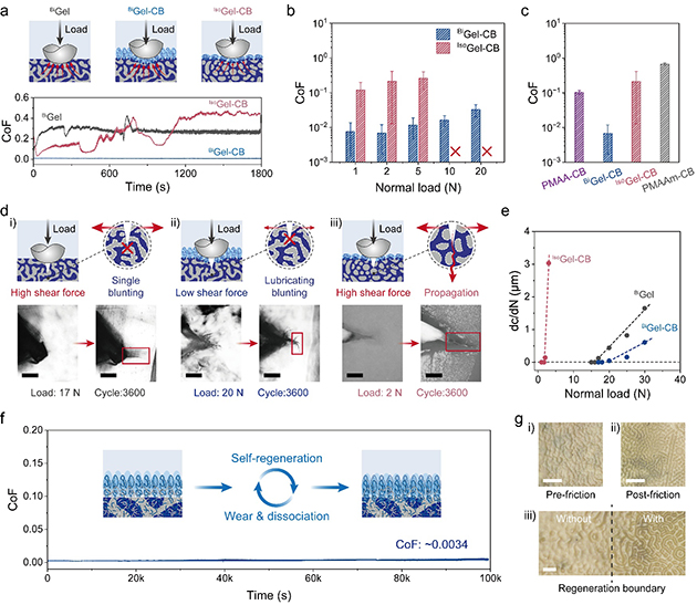图5.(a) 摩擦测试示意图及BiGel、BiGel-CB和IsoGel-CB对应的摩擦系数曲线。(b) BiGel-CB和IsoGel-CB摩擦系数随载荷的变化。(c) PMAA-CB、BiGel-CB、PMAAm-CB和IsoGel-CB样品的平均摩擦系数。(d) 摩擦裂纹扩展示意图及 i) BiGel, ii) BiGel-CB, iii) IsoGel-CB的裂纹光学图像(比例尺:200 μm)。(e) BiGel、BiGel-CB和IsoGel-CB的界面裂纹扩展速率随载荷的变化。(f) BiGel-CB在50 N法向载荷下的长期润滑性能。(g) BiGel-CB在PBS溶液中摩擦测试前后的表面光学图像:i) 摩擦前,ii) 摩擦后,iii) 摩擦边界(比例尺:200 μm)。