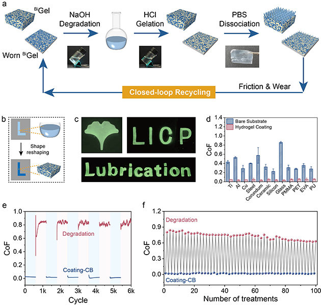 图6.(a) 鲁棒润滑系统的闭环回收示意图。(b) 形状重塑过程示意图。(c) 制造的不同形状水凝胶图案(银杏叶、研究所徽章“LICP”、文字“Lubrication”)。(d) 水凝胶涂层与相应裸基底摩擦系数的对比。(e) 降解-重建循环过程中的摩擦系数曲线及(f)平均摩擦系数值对比(以玻璃为基底,“处理次数”以奇数次代表涂层、偶数次代表降解来表征)。