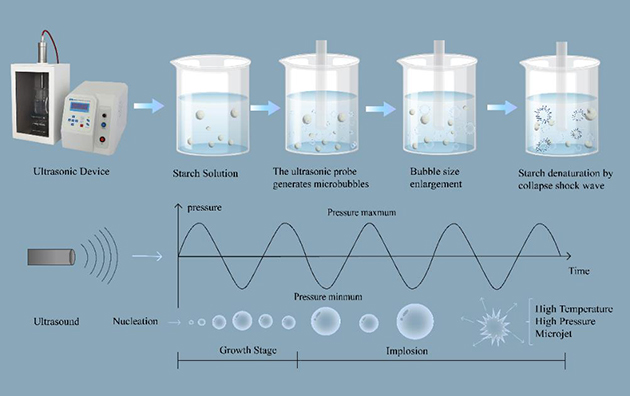 超声波辅助淀粉改性是一种新兴的绿色物理方法,它利用空化效应和机械剪切作用破坏淀粉的结晶区域,改变颗粒形态,增加比表面积,从而有效提升淀粉的溶解性、亲水性和功能特性。相比传统的化学和酶法改性方式,超声波改性避免了化学试剂的使用及生物催化剂的残留,更安全且环保。