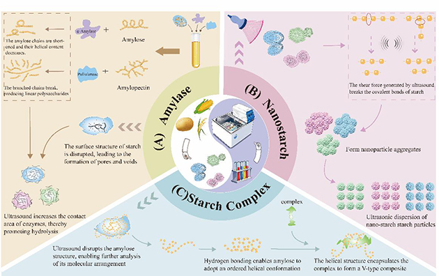 相关研究工作以“Advances in ultrasound-assisted starch modification: Parameter optimization, structure–property relationships, and synergistic strategies”为题发表在Carbohydrate Polymers(2026, 124907)上。郑晓渊助理研究员与曾凡逵研究员为共同通讯作者。