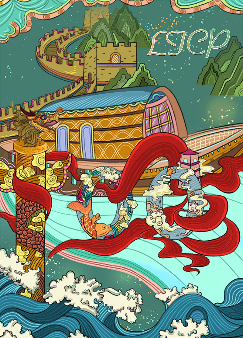 国风元素和装饰性线条相互融合,彰显祖国的美好未来,表达了科技工作者严谨的研究态度,体现了对祖国和党最美好的祝愿。