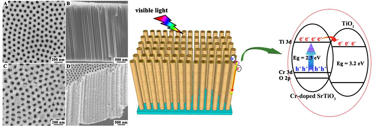 本课题组研究人员采用了原位水热反应的方法,通过控制水热反应的动力学因素,实现了二氧化钛纳米管与铬掺杂的钛酸锶相复,成功制备了Cr-doped SrTiO3/TiO2异质复合纳米管阵列。由于钛酸锶具有稳定的立方晶系钙钛矿结构,因而适宜进行铬离子掺杂。此外,铬离子掺杂的钛酸锶,由于在钛酸锶的价带和导带之间,会形成新的Cr3d能带,从而可以有效的减小钛酸锶的禁带宽度,因而首次实现SrTiO3/TiO2异质复合纳米管阵列其在可见光区的光电及光催化性能。相关研究结果发表在英国自然出版社的Scientific Reports期刊, (Scientific Reports, 2013, 3, 2720)