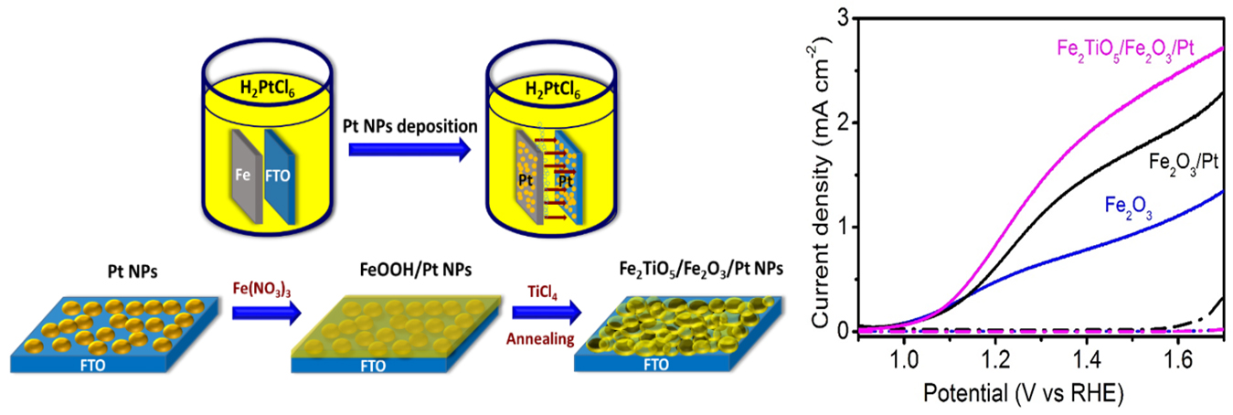 Fe2TiO5/Fe2O3/Pt光阳极合成示意图及光电催化分解水性能。