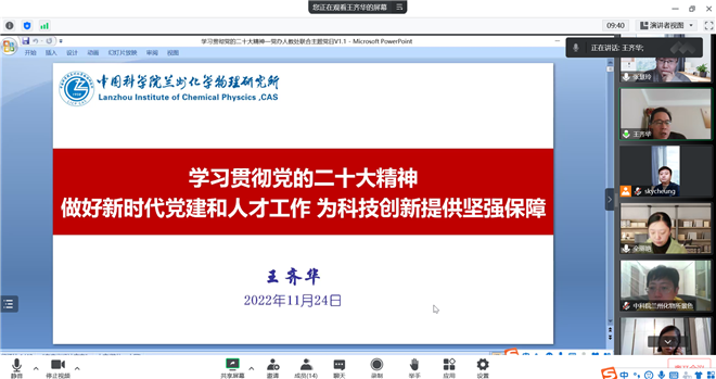 11月24日,中国科学院兰州化学物理研究所党委书记王齐华为分工联系的党委办公室党支部、人事教育处党支部作了题为《学习贯彻党的二十大精神做好新时代党建和人才工作 为科技创新提供坚强保障》的报告。两个支部全体党员参加活动。