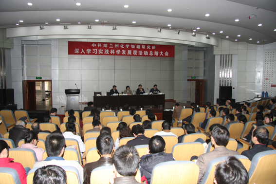 2月24日下午,兰州化物所在理化楼一楼学术厅召开了由全所党员参加的深入学习实践科学发展观活动总结大会。会议由党委委员、所长刘维民主持。党委书记、副所长赵秀茹在会上做了兰州化物所开展深入学习实践科学发展观活动总结报告。王齐华副所长向大家宣布了群众满意度测评结果。兰州分院党组书记、副院长王学定出席了会议并做了重要讲话。