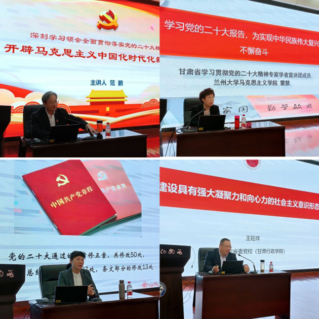 中共甘肃省委党校文史教研部主任王旺祥教授,甘肃省委专家学者宣讲团成员、中共甘肃省委党校党的建设与领导科学教研部主任高璐佳,甘肃省学习贯彻党的二十大精神专家学者宣讲团成员、兰州大学马克思主义学院蒙慧教授,甘肃省委专家学者宣讲团成员、兰州大学范鹏教授分别应邀作了题为“建设具有强大凝聚力和向心力的社会主义意识形态”“党的二十大党章修改的重点内容及其重大深远历史意义”“学习党的二十大报告,为实现中华民族伟大复兴不懈奋斗”“深刻学习领会全面贯彻落实党的二十大精神 开辟马克思主义中国化时代化新境界”的报告。