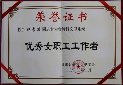 赵秀茹书记获甘肃省教科文卫工会“优秀女职工工作者”荣誉称号