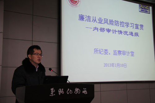 兰州化物所监察审计室主任、党政办公室主任张长春向大家介绍了廉洁从业风险防控工作的背景、研究所开展内部审计的目的,通报了研究所针对2012年结题项目进行内部审计的情况,指出了审计中发现的问题,并就这些问题提出了建议及整改措施。