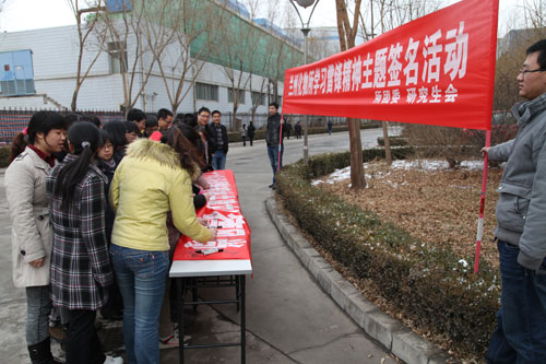 今年是雷锋同志逝世50周年,也是毛泽东同志“向雷锋同志学习”题词49周年。为积极响应中央和院党组关于深入开展学雷锋活动的号召,在全所营造学习雷锋精神,争当岗位先锋和道德标兵的良好氛围,在3月5日雷锋纪念日来临之际,兰州化物所团委和研究生会在科研园区开展了“大力弘扬雷锋精神,树立文明道德风尚”主题签名活动。