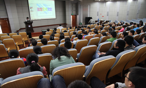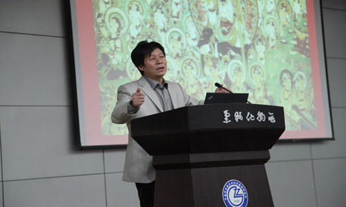 敦煌莫高窟被誉为20世纪最有价值的文化发现,以精美的壁画和塑像闻名于世,被称为民族艺术的瑰宝,世界艺术的珍品。文化教授向大家比较完整地介绍了敦煌文化艺术产生的历史文化背景、敦煌藏经洞的发现和敦煌学问世的过程以及敦煌壁画的主要内容与艺术风格。文化教授首先从敦煌的名称与建置谈起,他对“敦薨说”和“吐火罗说”两种不同敦煌名称来源的讲解引起了大家的兴趣。他还向大家阐述了甘肃厚重的文化底蕴、古丝绸之路上独特的地理位置对形成敦煌艺术的不同作用。讲座对20世纪上半叶敦煌藏经洞发现后被掠夺摧残及抢救保护的历史做了简要介绍,这座文化艺术宝库曾经遭受的苦难让在座的每一位青年无不叹息心痛。文化教授重点结合壁画中的精品,对敦煌壁画的艺术风格进行了详细深入的介绍。耳中聆听着感人至深的壁画故事,眼前欣赏着造型多样、线条凝练、色彩瑰丽的幅幅壁画,让大家恍如置身于“天衣飞扬,满壁风动”的敦煌石窟之中。