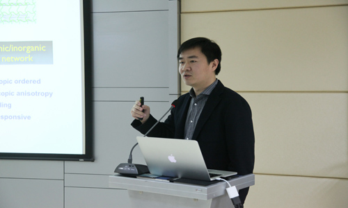 刘文广教授为大家作了题为“面向生物医用的高强度水凝胶”的报告,介绍了高强度水凝胶在生物医学领域的应用需求、优势及存在的主要问题,并重点结合其长期从事的多功能高强度水凝胶及非病毒转基因载体等生物医用高分子材料研究工作,详细介绍了具有高强度、形状记忆、光敏感、自愈合特性水凝胶的构建方法以及这些新颖软湿材料在基因转运、细胞包埋、生物3D打印等生物医用领域的实际应用。刘明杰教授作了题为“Bio-inspired design of functional hydrogel: from 2D surfaces to 3D networks”的报告。他首先介绍了其研究团队受自然界特殊功能生物表界面如鱼鳞、关节软骨等的启发,构筑水凝胶修饰合金支架和超疏水水凝胶等特殊2D表面的方法、作用机理和应用示范。随后,他着重介绍其团队利用超导磁场诱导纳米片组装制备各向异性的3D网络水凝胶材料,以及由此类材料制备的热刺激各向异性的驱动器材料,他用形象的动画展示了该类材料的设计思路及材料的形成和作用机理。