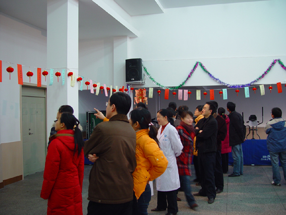 经过精心装饰的活动室,在节日的气氛里显得更加富有生气和活力。主席台正上方红色背景上“2008新年游艺会——所庆五十周年系列活动”几个彩色大字显得格外引人注目。四周白色墙壁上点缀装饰的彩色花环和红色小灯笼更使大家在寒冷的冬日里感受到了几份暖意。