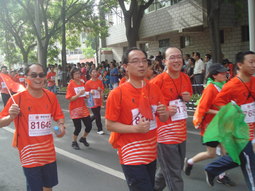 10日早晨6:40,当兰州化物所的参赛队员身着橙色的比赛服装来到兰州东方红广场的起跑点时,这里已是人山人海,三万名马拉松参赛者身穿橙色的比赛服装,在广场两边绿树红花的映衬下,显得格外绚丽。大家也被赛前的氛围所感染,纷纷交换着相机,变换着组合,不停的合影留念。早上8时15分,随着发令枪响,选手们挥舞着彩旗冲出红色拱门,一时间欢呼声、呐喊声汇成一片,宽阔的天水路,瞬时变成了一条橙色的“河流”。在这汹涌的人潮中,兰州化物所高举的中国科学院院旗和兰州化物所所旗,像两叶蓝色的风帆,在红色的河流中不断向前,所到之处迎来了市民们的阵阵掌声。在院旗、所旗的指引下,兰州化物所的参赛队员,以兴奋而激动的心情、饱满的热情,秉承坚韧不拔、永不放弃的马拉松精神,围绕着鲜艳的科学蓝,向着终点奋力前进。最终,兰州化物所的参赛队员全部坚持跑完了5公里的全程。