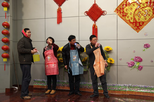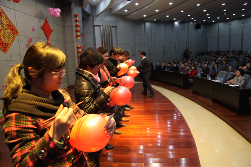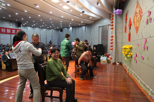 随后,由先进润滑与防护材料研发中心分会郭芳、丁奇表演的诗朗诵《我们过年》拉开了迎春联欢会的序幕,声情并茂的朗诵抒发了兰州化物所人对过去的深情告别和对美好未来的殷殷期盼。由各分会表演的文艺节目精彩纷呈,让人目不暇接,既有活泼动人、激情四溢的舞蹈表演,也有热情高亢、婉转动听的倾情演唱,多才多艺的表演充分展示了研究所职工蓬勃向上、团结奋进的精神风貌。为了让在场的观众也能积极参加进来,所工会为大家准备了“合力吹坐气球”、“穿针引线”、“数钱问答”、“你来比划我来猜”等妙趣横生的互动游戏节目。全场职工以各分会为单位积极登台,踊跃参加,踩气球、学模特、抢答题,在紧张有趣的游戏中大家甩开平日里繁忙工作和生活带来的压力,彻底放松心情,分享沟通合作的快乐,互相传递节日的美好祝愿,台下观众也不时爆发出一阵阵热烈的喝彩和笑声。联欢会中还穿插了多轮激动人心、扣人心弦抽奖互动节目,设置了一、二、三等共60个大小奖项,分别由薛群基院士、赵秀茹书记、夏春谷所长、王齐华副所长、师彦平副所长、实验室主任、研究员和现场观众为大家抽取。随着每一轮奖项的揭晓,现场的欢呼声和掌声此起彼伏,不断掀起联欢会的一阵阵热潮。