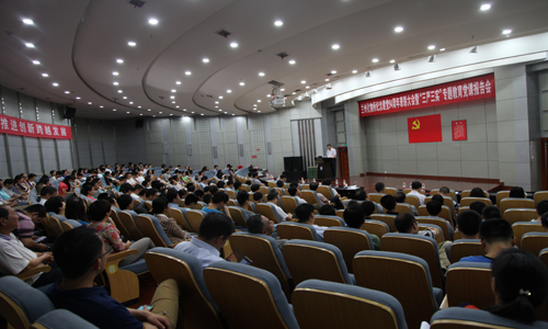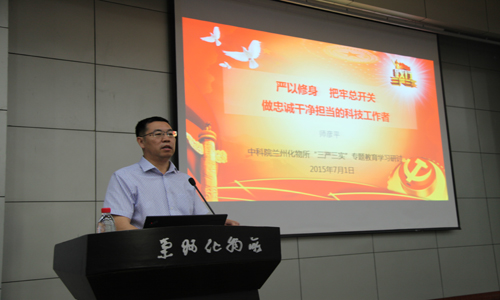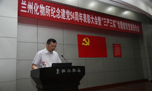 为纪念中国共产党建党94周年,推进研究所“三严三实”专题教育,7月1日上午,中国科学院兰州化学物理研究所在理化楼一楼学术厅隆重召开“七一”表彰大会暨“三严三实”专题教育党课报告会。会议由所党委委员、所长夏春谷主持。所党委委员、副所长师彦平作了题为《严以修身,把牢总关口,做忠诚干净担当的科技工作者》的党课报告。党委委员、全所在职职工党员、研究生党员,部分离退休老党员和民主党派、入党积极分子代表近300人参加了大会。