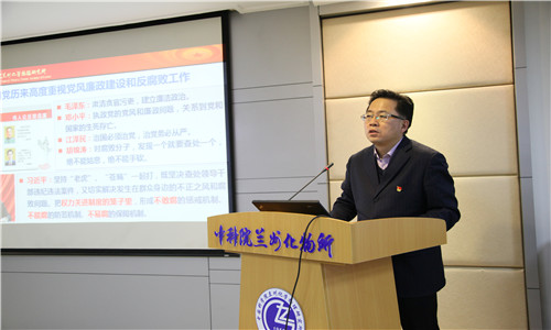 兰州化物所党委书记、所长王齐华作了题为“履行全面从严治党责任 护航科技创新事业”的党课报告。报告结合党的十九大精神和习近平总书记的重要指示精神,讲解了全面从严治党的重要背景和现实意义,梳理了中央和院党组党风廉政建设的制度规定与要求,通报了十八大以来中科院系统内党员干部违纪典型案例,并结合研究所实际情况对下一步重点工作进行了安排部署。