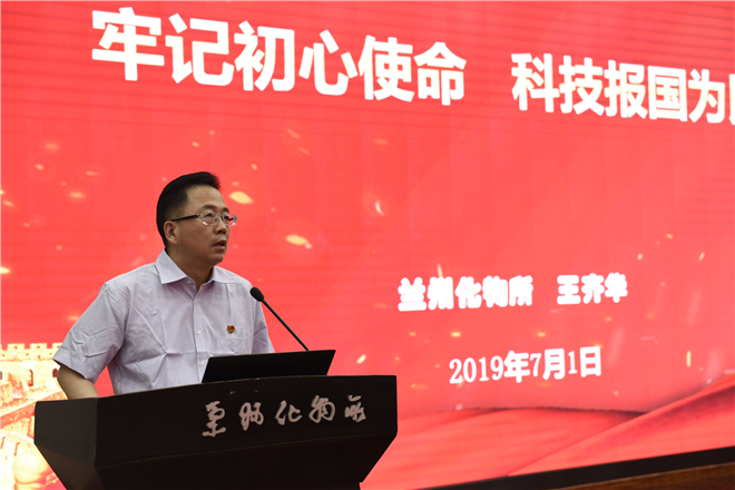党委书记、所长王齐华作了题为《牢记初心使命 科技报国为民》的党课报告。报告首先组织大家再次学习了开展“不忘初心 牢记使命”主题教育的重要意义、总要求和目标任务。随后从“建立中国共产党、成立中华人民共和国、推进改革开放和中国特色社会主义事业”三大历史性事件和三大里程碑以及党纲党章的发展变化为脉络和线索,带领大家共同探寻了党的初心和使命。接着从中科院六次办院方针的调整讲述了中科院人的初心和使命,并从研究所的发展历程和历史贡献方面讲述了兰州化物所人的使命和担当。最后,他结合习近平总书记对中科院提出的“三个面向、四个率先”的要求和近期刘鹤副总理调研中科院工作时的讲话精神,就全所党员如何践行“创新科技、报国为民”的初心和使命提出了具体要求:一要加强习近平新时代中国特色社会主义思想学习,学懂弄通做实,强化理论武装,指导科研创新。二要时刻审视自己的入党动机和工作动力,把为人民服务,为共产主义奋斗作为价值追求,作为工作的根本目的。三要大力弘扬科学家精神,加强作风和学风建设。四要把扎实开展主题教育和扎实做好科学研究紧密结合起来,加强关键核心技术攻关,努力产出重大创新成果,为建设世界科技强国作贡献。