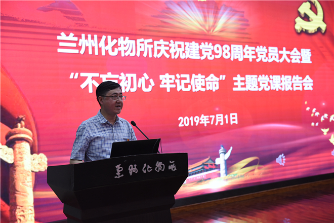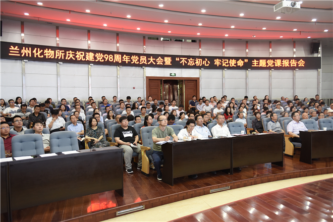 为庆祝中国共产党成立98周年,7月1日下午,中国科学院兰州化学物理研究所举办了庆祝建党98周年党员大会暨“不忘初心、牢记使命”主题党课报告会。所党政领导、党委委员和全所在职职工党员、研究生党员、部分离退休党员以及民主党派代表等300多人参加了大会。会议由所党委委员、副所长赵培庆主持。