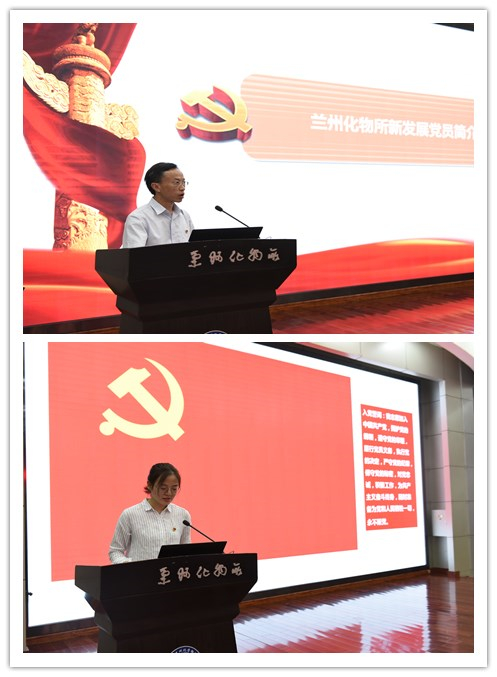 会议首先举行了入党宣誓仪式。党委委员、副所长周峰组织新党员学习了《党章》总纲和第一章中“党员的义务和权利”等内容。参加宣誓仪式的新党员所在党支部书记代表、中科院西北特色植物资源化学重点实验室党支部书记邵士俊致辞,对新党员提出了要求和希望。陈建、张曦元等10名同志在赵培庆的带领下面向党旗,高举右拳庄严宣誓,光荣加入中国共产党。与会全体党员共同起立重温了入党誓词。所党委委员和正式党员代表为新党员佩戴了党徽并赠送了《党章》。精细石油化工中间体国家工程中心党支部张琳雯代表全体新党员做了表态发言,她表示,全体新党员将以党员标准严格要求自己,努力提升思想政治觉悟,认真完成科研学习任务,积极发挥先锋模范作用,以优异的成绩回报祖国和社会。