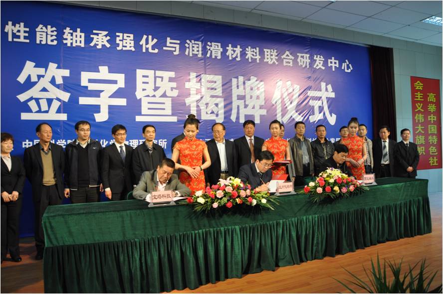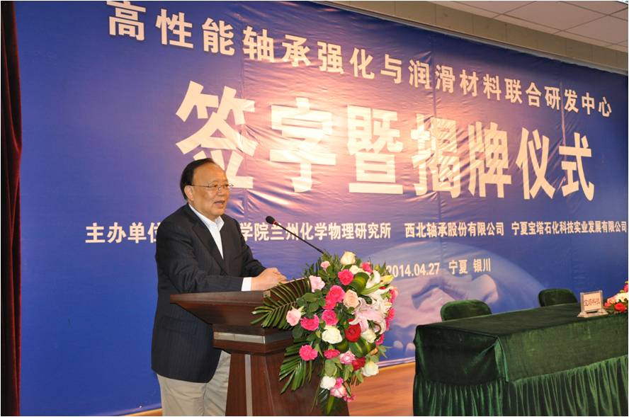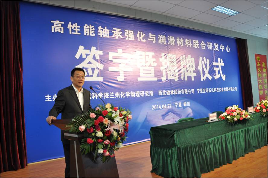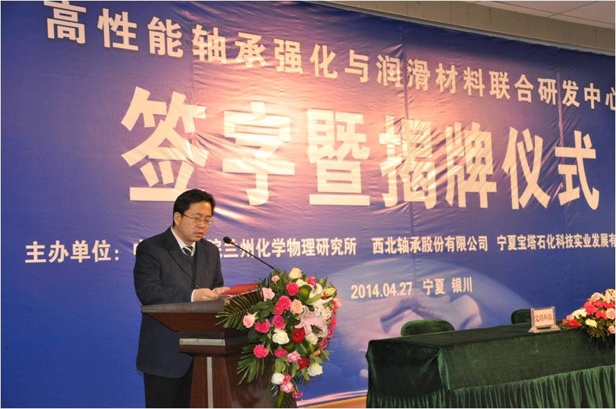4月27日,中国科学院兰州化学物理研究所和西北轴承股份有限公司、宁夏宝塔石化科技实业发展有限公司在银川签订合作协议联合共建“高性能轴承强化与润滑材料联合研发中心”,并举行中心揭牌仪式。兰州化学物理研究所学术委员会主任薛群基院士、所党委书记王齐华研究员、科技处张兵处长、固体润滑重点实验室副主任王立平研究员、我所李维民、张广安、丁奇和吴贵智博士出席了仪式。