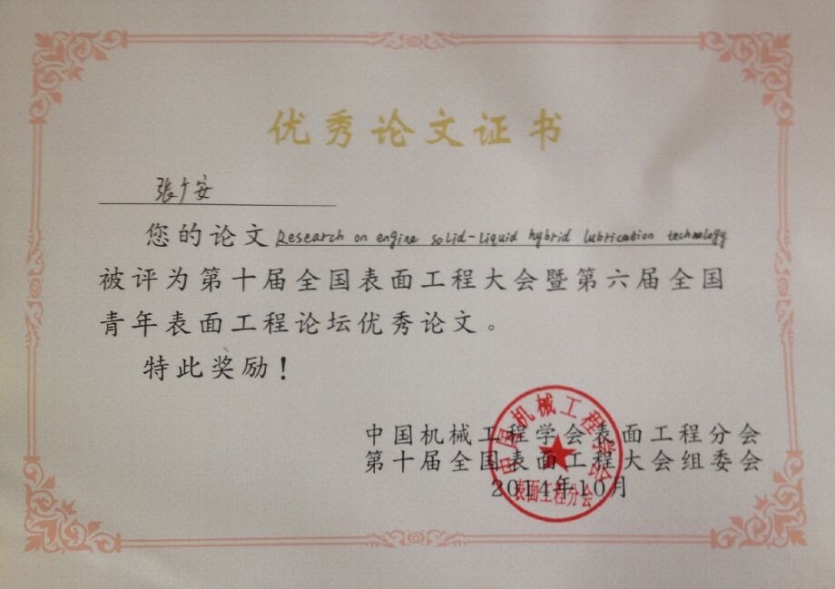 课题组王立平研究员于本次大会受聘为中国机械工程学会表面工程分会第五届委员会委员,张广安副研究员于本次大会期间受聘为中国机械工程学会表面工程分会青年工作委员会委员。中科院兰州化物所荣获“支持学会工作特别贡献奖”,张广安副研究员荣获青年表面工程论坛优秀论文奖。