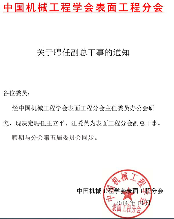 经中国机械工程学会表面工程分会主任委员办公会研究决定,聘请王立平研究员等为中国机械工程学会表面工程分会副总干事,聘期自2014年10月起。