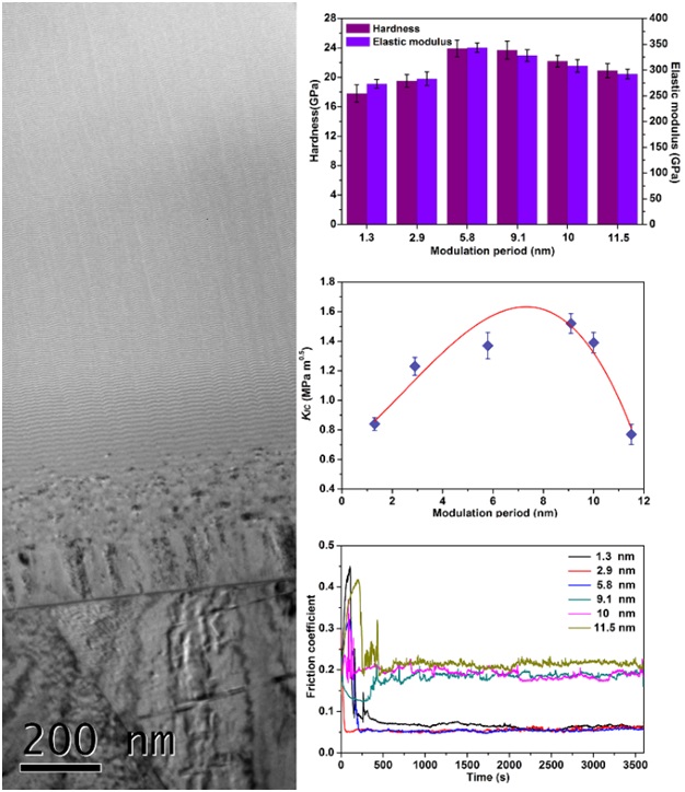 WC/a-C纳米多层膜截面TEM及其硬度与弹性模量,断裂韧性及摩擦系数随调制周期的变化情况