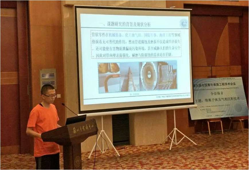 张铭炯做了题为“空心阴极法在不锈钢管内壁沉积累金刚石薄膜及其腐蚀与摩擦学性能研究”的报告