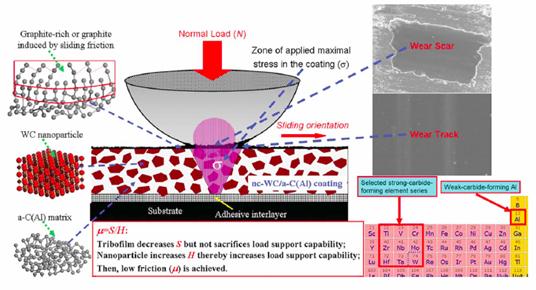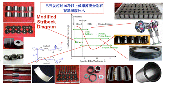 采用等离子体基PVD和CVD薄膜沉积技术,基于非晶-纳米晶复合结构、多层梯度、多元掺杂、多相复合、微/纳表面织构等多尺度耦合设计理念实现纳米复合薄膜的结构可控和功能构筑。突破薄膜与各种金属及特殊底材的结合、大面积均匀沉积、极端形状部件表面可靠结合以及管内壁高速沉积等技术瓶颈,发展了系列水(介质腐蚀)环境、高真空、高载高速、特殊气氛以及发动机环境用高性能碳基固体润滑薄膜,揭示薄膜在多因素耦合环境下的损伤模型和寿命控制规律。