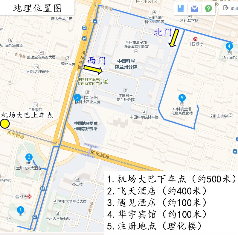(2)机场乘车路线:兰州中川机场距离市区75多公里,出租车费用约200元;机场大巴到城关区东方大酒店门口(对面是兰州大学),步行570米到中科院兰州分院。