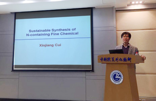 4月16日,瑞士洛桑联邦理工大学崔新江博士应邀到中国科学院兰州化学物理研究所进行学术交流,并作了题为“Sustainable Synthesis of N-Containing Fine Chemicals”的学术报告。报告中,崔新江博士介绍了他在含氮精细化学品合成以及二氧化碳、生物质等碳资源高效利用等方面的研究成果,重点对特定催化反应中催化体系的设计和制备方法等进行了交流。报告会后,崔新江博士与参会师生进行了深入讨论。
