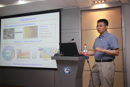 报告会上,赵永生研究员从无机-有机光子学材料比较开始,对有机纳米光子学材料的发展、优势、特性等做了深入浅出的讲解。从基于电子学的“电脑”到基于光子学的“光脑”,从电子在电缆中的运动到光子在光纤中的传输,赵永生研究员深入浅出,生动形象地讲述了纳米光子学材料的制备、性能以及应用,详细阐述了基础理论研究和实际应用的联系。报告结束后,赵永生研究员与与会老师和同学们进行了互动交流,并对提出的问题作了详细地讲解。