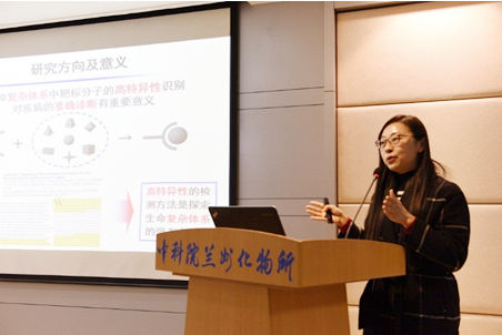 本次论坛邀请了武汉大学袁荃和袁必锋教授、中国地质大学(武汉)夏帆教授和华中科技大学娄筱叮副教授,分别作了题为“基于分子识别的诊疗探针的设计与应用”“基于质谱技术的核酸修饰研究”“基于纳米孔道的非1:1型生物分子检测”和“化学生物传感过程中信号单元群体行为研究”的学术报告。论坛由兰州化物所周峰研究员和邱洪灯研究员主持,70余名相关领域科研人员和研究生参加了论坛。