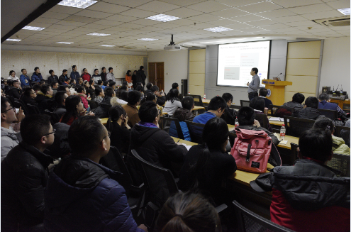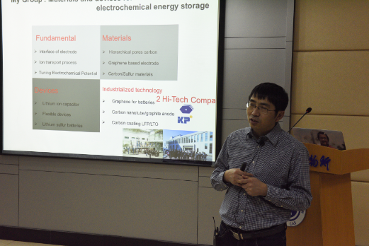 李峰研究员作了题为“carbon based materials for electrochemical energy conversion and stogages”的学术报告,介绍了中科院金属研究所先进碳材料研究部概况,并从碳材料与超级电容器、设计高能量密度材料、超级电容器电位调控等三个方面详细介绍了其课题组在电化学能量存储材料和器件方面的研究成果。他们从孔结构认识、设计、制备并充分利用碳材料电化学的特性来调控其器件应用,发展了智能型电化学电容器,并对碳材料在电化学电容器领域的应用前景进行了展望。