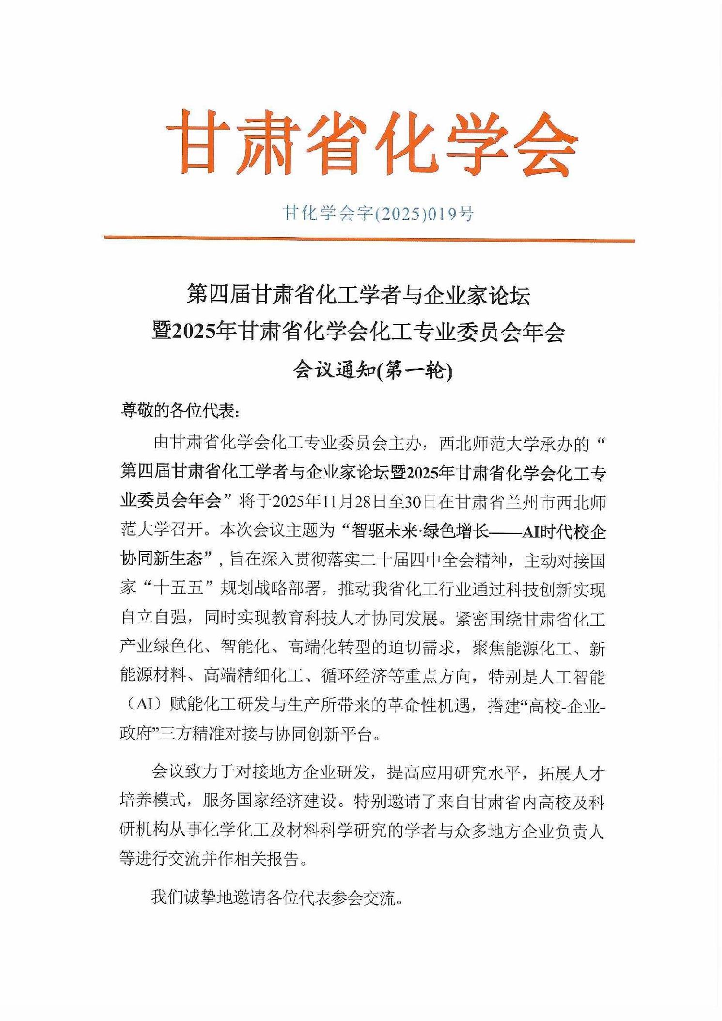 第四届甘肃省化工学者与企业家论坛 暨2025年甘肃省化学会化工专业委员会年会 会议通知(第一轮))