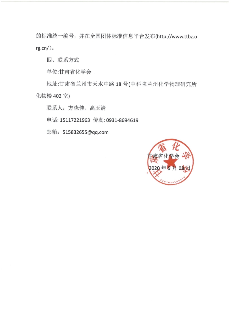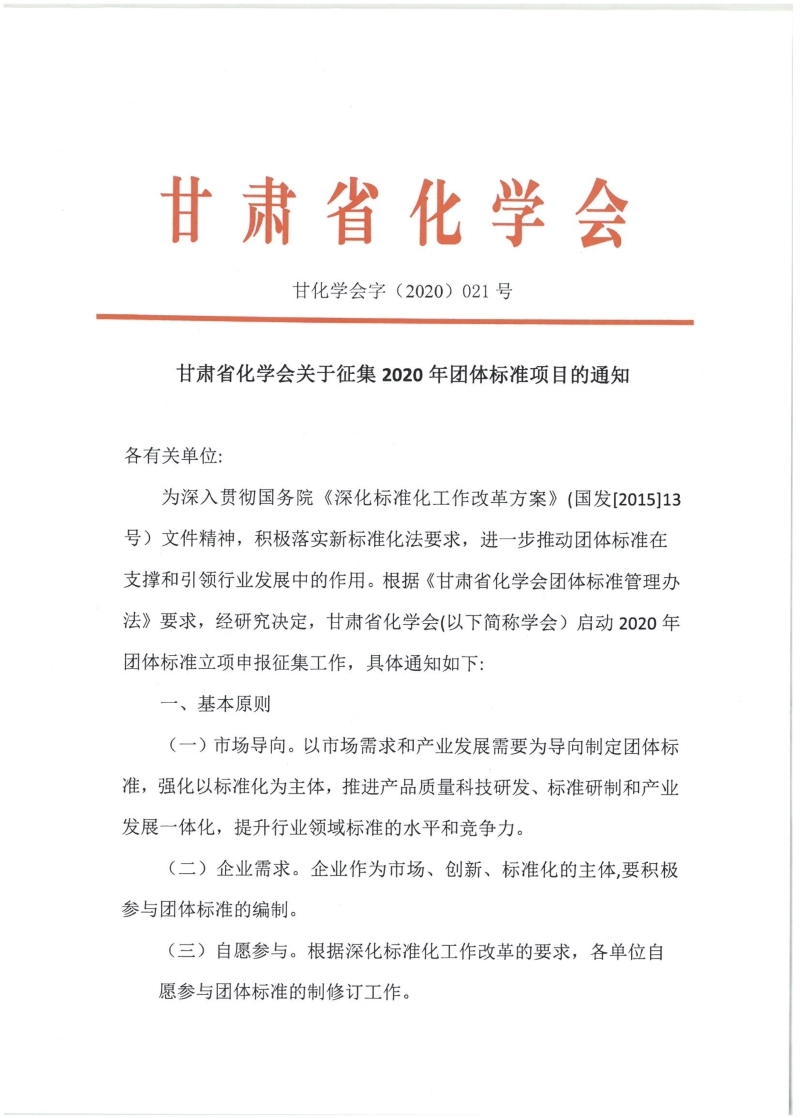 甘肃省化学会关于征集2020年团体标准项目的通知