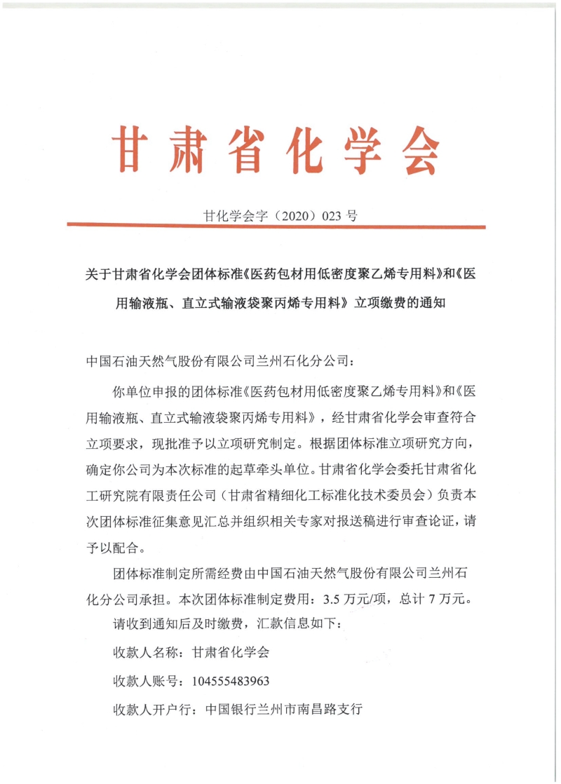 关于甘肃省化学会团体标准《医药包材用低密度聚乙烯专用料》和《医用输液瓶、直立式输液袋聚丙烯专用料》立项缴费的通知