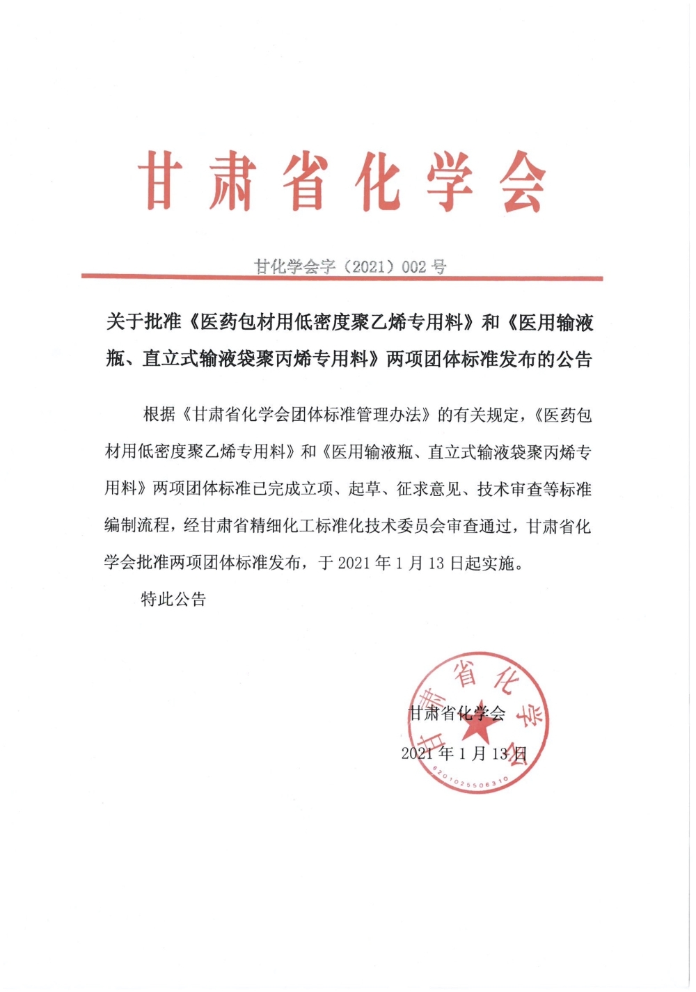 关于批准《医药包材用低密度聚乙烯专用料》和《医用输液瓶、直立式输液袋聚丙烯专用料》两项团体标准发布的公告