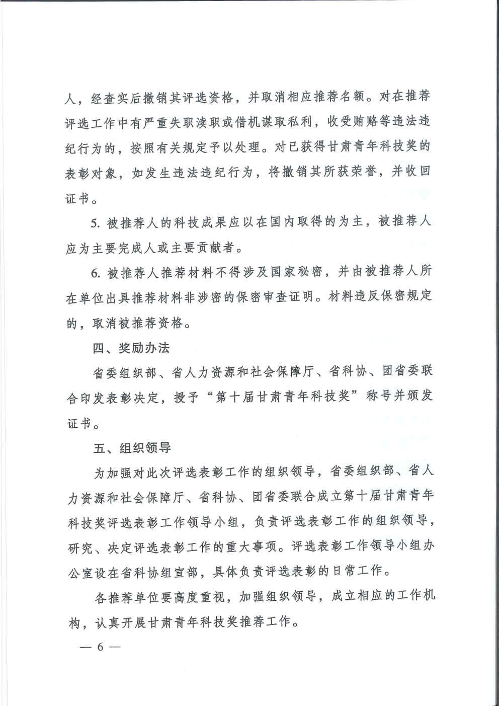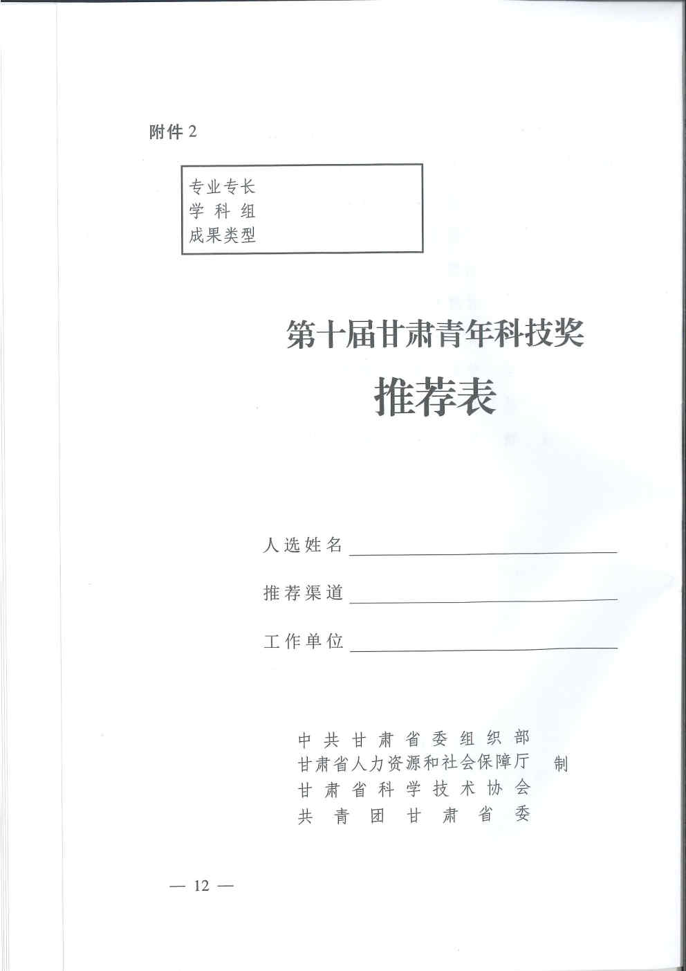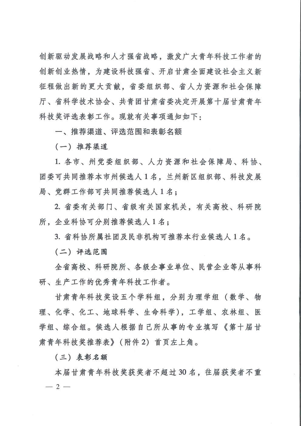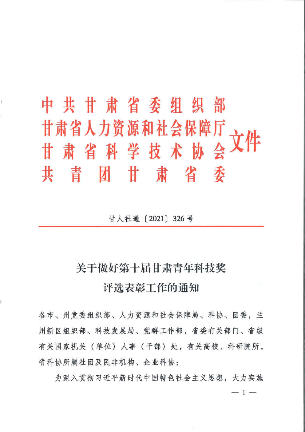 甘人社通【2021】326号 第十届甘肃青年科技奖评选表彰工作的通知
