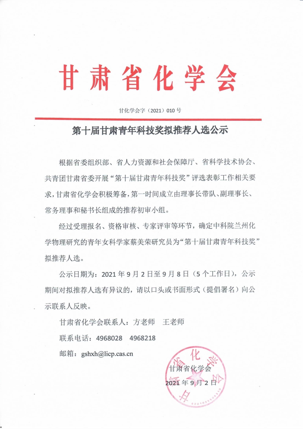 第十届甘肃青年科技奖拟推荐人选公示