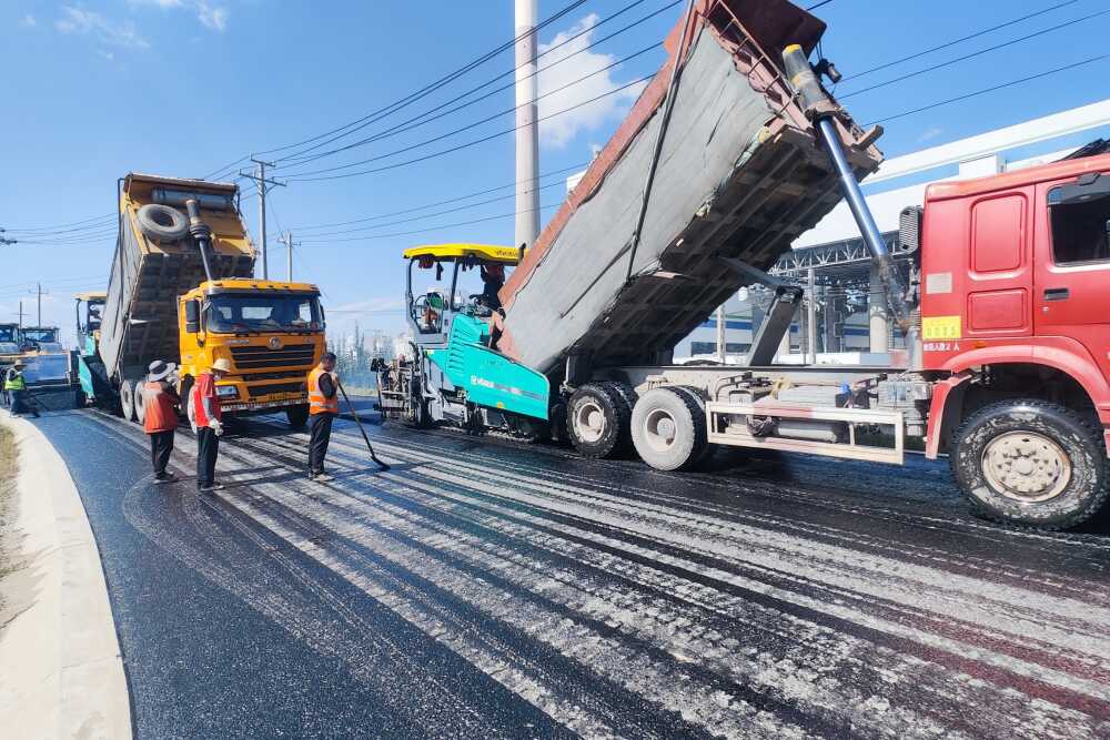 지난해 9월 21일 간쑤(甘肅)성 란저우(蘭州)에서 폐기된 풍력 터빈 블레이드를 활용한 아스팔트 혼합물로 도로를 포장하고 있다. (사진/신화통신)