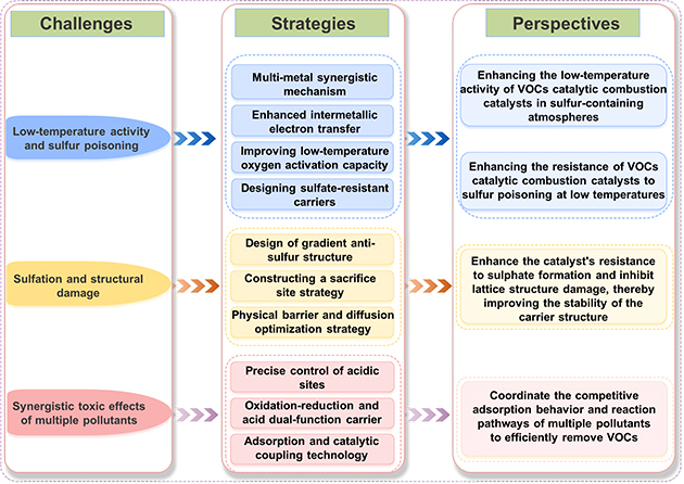 图2. VOCs催化燃烧抗硫催化剂面临的挑战、当前应对策略及该领域发展前景