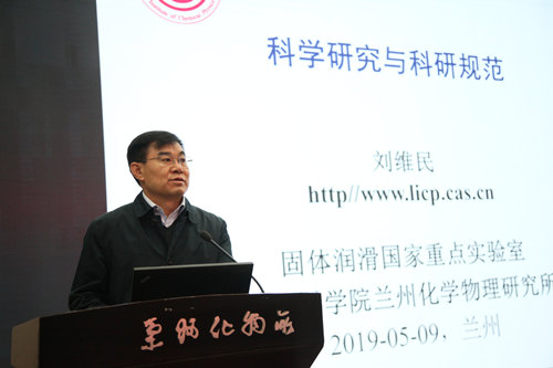 中国科学院院士、兰州化物所学术委员会副主任委员、学位委员会主席、科研诚信建设委员会主任刘维民研究员作了题为“科学研究与科研规范”的专题报告。刘维民以习近平总书记关于科技创新和师生关系列论述为指导,在简要梳理世界和中国科技发展史的基础上,用中国传统文化中师生关系的经典论述阐释了新时代导师和学生在科研工作分别承担的使命与职责,并通过国际国内一系列科研不端行为案例,深入浅出地讲解了遵守科研规范及诚信的重要意义和应当注意事项。