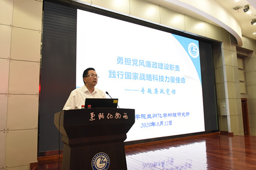 8月14日,中国科学院兰州化学物理研究所组织召开2020年廉政党课报告暨党风廉政建设责任书签订会,所领导、党委委员、纪委委员、实验室(中心)正副主任、课题组长、人才团队负责人,管理部门正副处长和关键岗位工作人员,党支部书记、支部纪检委员,所投资公司负责人等参加了会议。会议由党委副书记、纪委书记张长春主持。