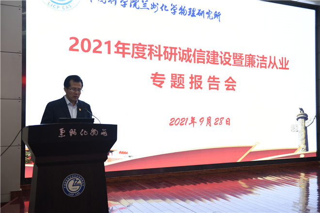 9月28日,中国科学院兰州化学物理研究所组织召开2021年度科研诚信建设暨廉洁从业专题报告会,近两年新入所职工和研究生200余人参加了会议,会议由党委副书记、纪委书记、研究所科研诚信建设委员会常务副主任张长春主持。